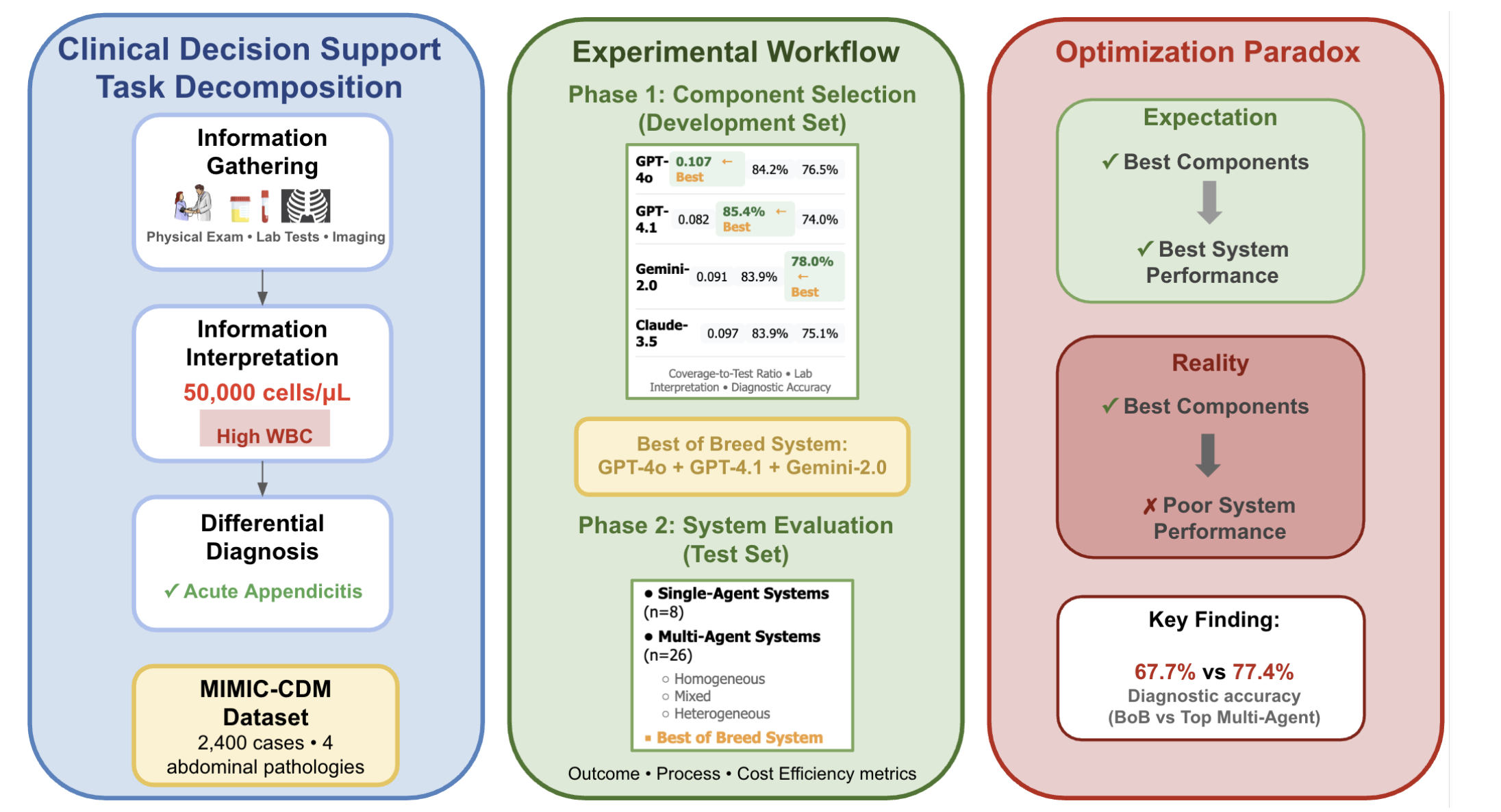 This work investigates how multi-agent AI systems perform in clinical diagnosis using 2,400 patient cases from the MIMIC-CDM dataset. Comparing single-agent and multi-agent models across abdominal pathologies, the study uncovered a paradox: even “best of breed” systems with highly optimized components underperformed in overall diagnostic accuracy. The findings highlight that successful healthcare AI requires end-to-end validation and careful attention to information flow between agents, rather than focusing solely on component-level optimization.